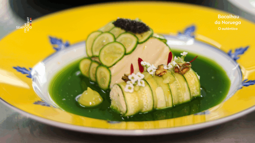 | Bacalhau em duas texturas, abobrinha scapece e molho de clorofila | Uma abordagem moderna, utilizando postas e aparas do bacalhau, acompanhada de canelone de bacalhau e purê de abobrinha, demonstrando o aproveitamento integral do pescado. |