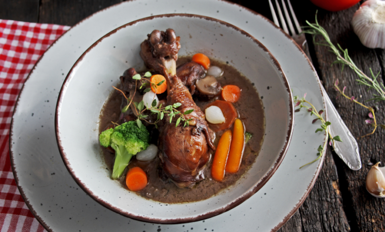 Coq au vin (frango braseado no vinho com fundo aromático)